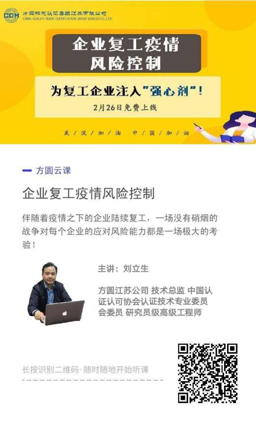 近日,隨著各地陸續復工復業,企業復工的疫情風險控制成為重中之重。方圓江蘇公司心系客戶,響應國家號召,履行社會責任,由客服培訓部打造的網絡培訓平臺——“方圓云課堂”日前成功啟動,為企業遠程學習提供便利和幫助。2月26日,由技術總監劉立生主講的第一期《企業復工疫情風險控制》課程正式上線。