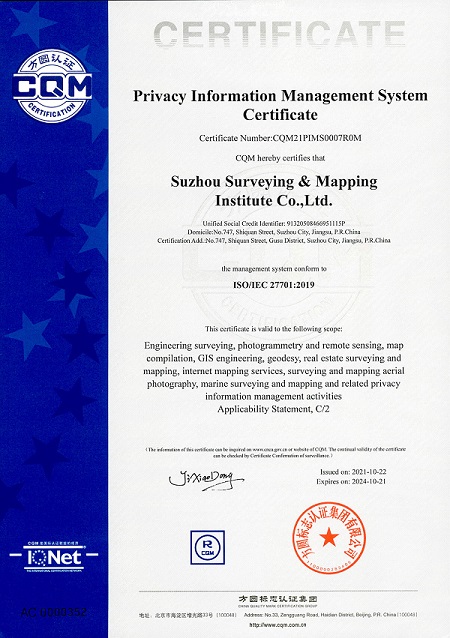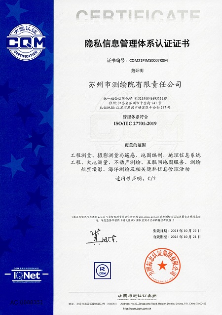 時間:2021年11月01日 近日,方圓江蘇公司為蘇州市測繪院有限責(zé)任公司頒發(fā)我司首張“隱私信息管理體系認(rèn)證”認(rèn)證證書。認(rèn)證范圍為:工程測量、攝影測量與遙感、地圖編制、地理信息系統(tǒng)工程、大地測量、不動產(chǎn)測繪、互聯(lián)網(wǎng)地圖服務(wù)、測繪航空攝影、海洋測繪及相關(guān)隱私信息管理活動。